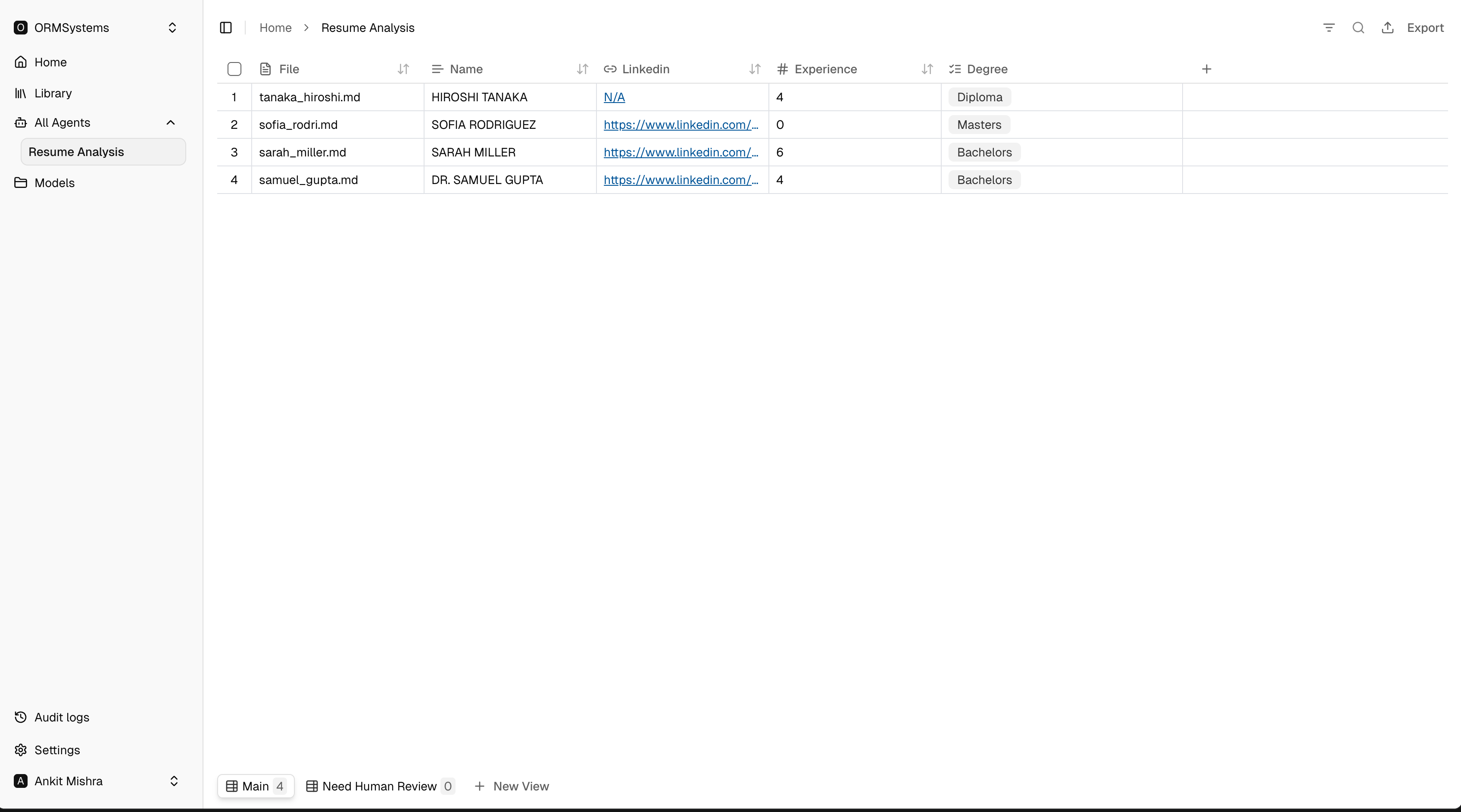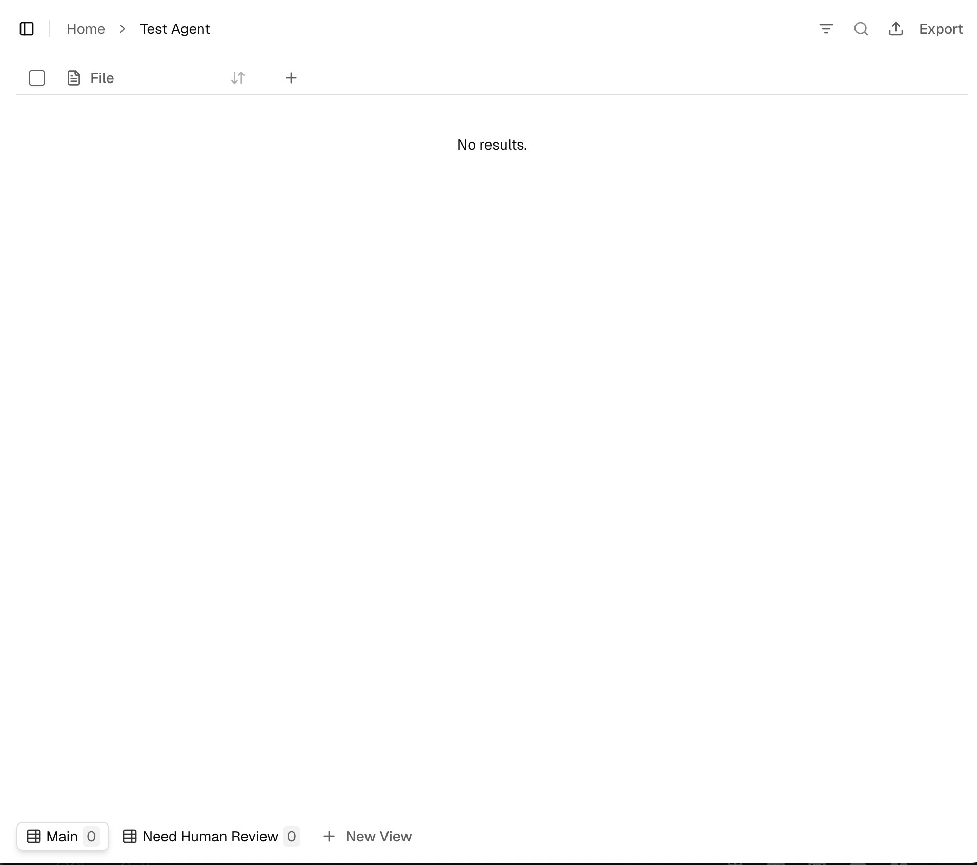 At the bottom of the results table you will see multiple views — for example Main and Need Human Review — and the option to create a New View.