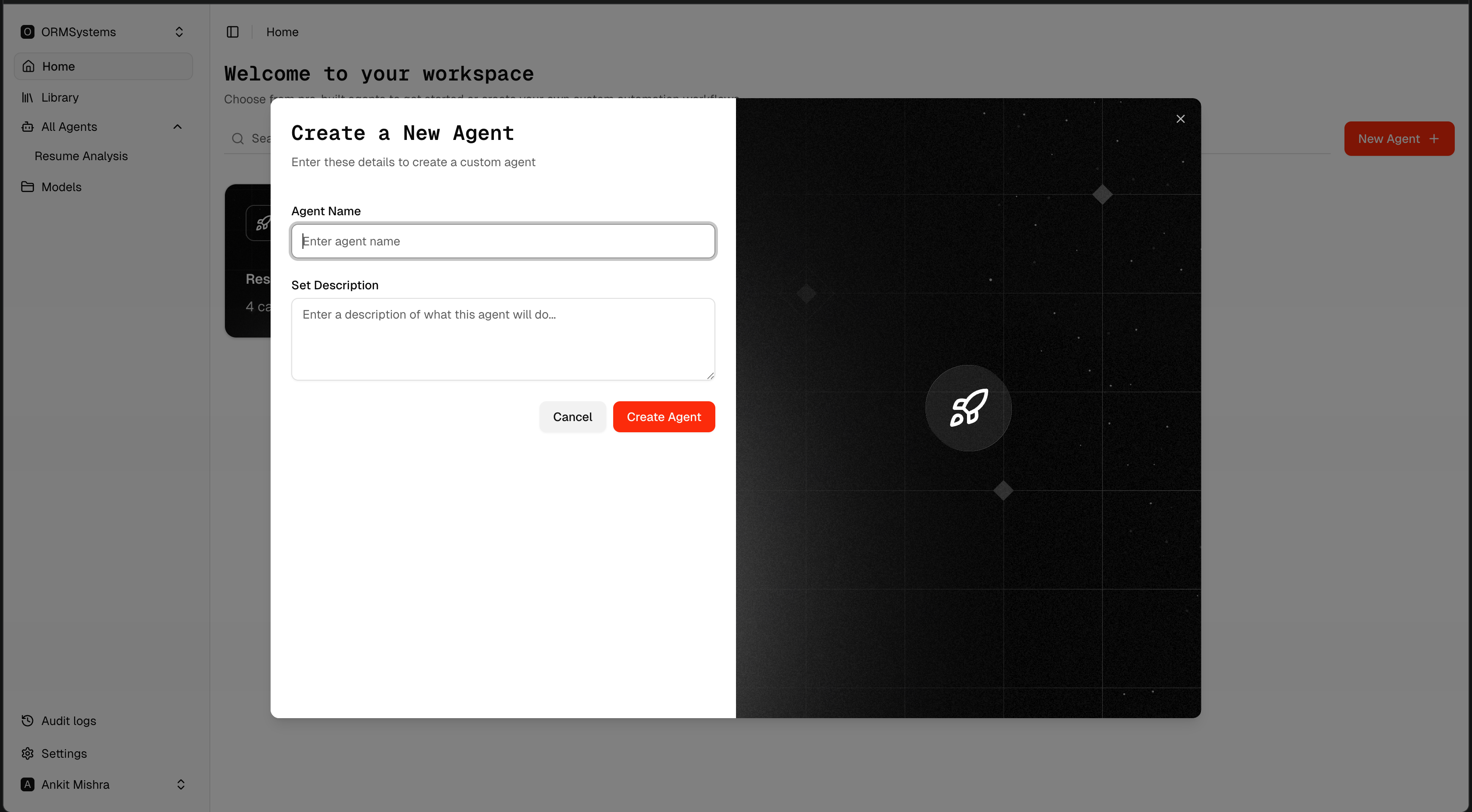 - Click New Agent and enter the agent name and description.