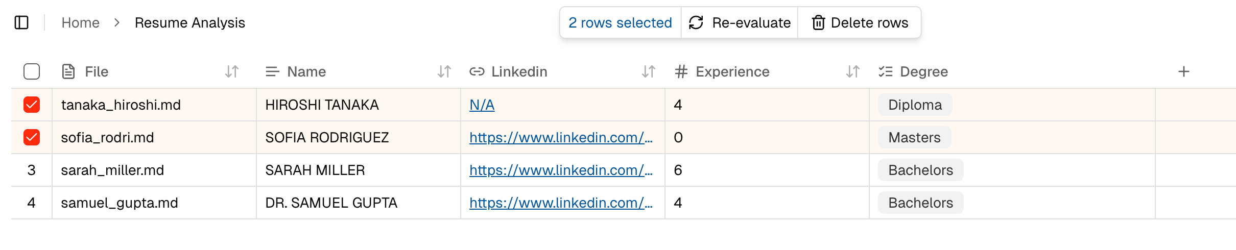 Asset Level — Select one or more rows to run extraction for those specific files across all fields.