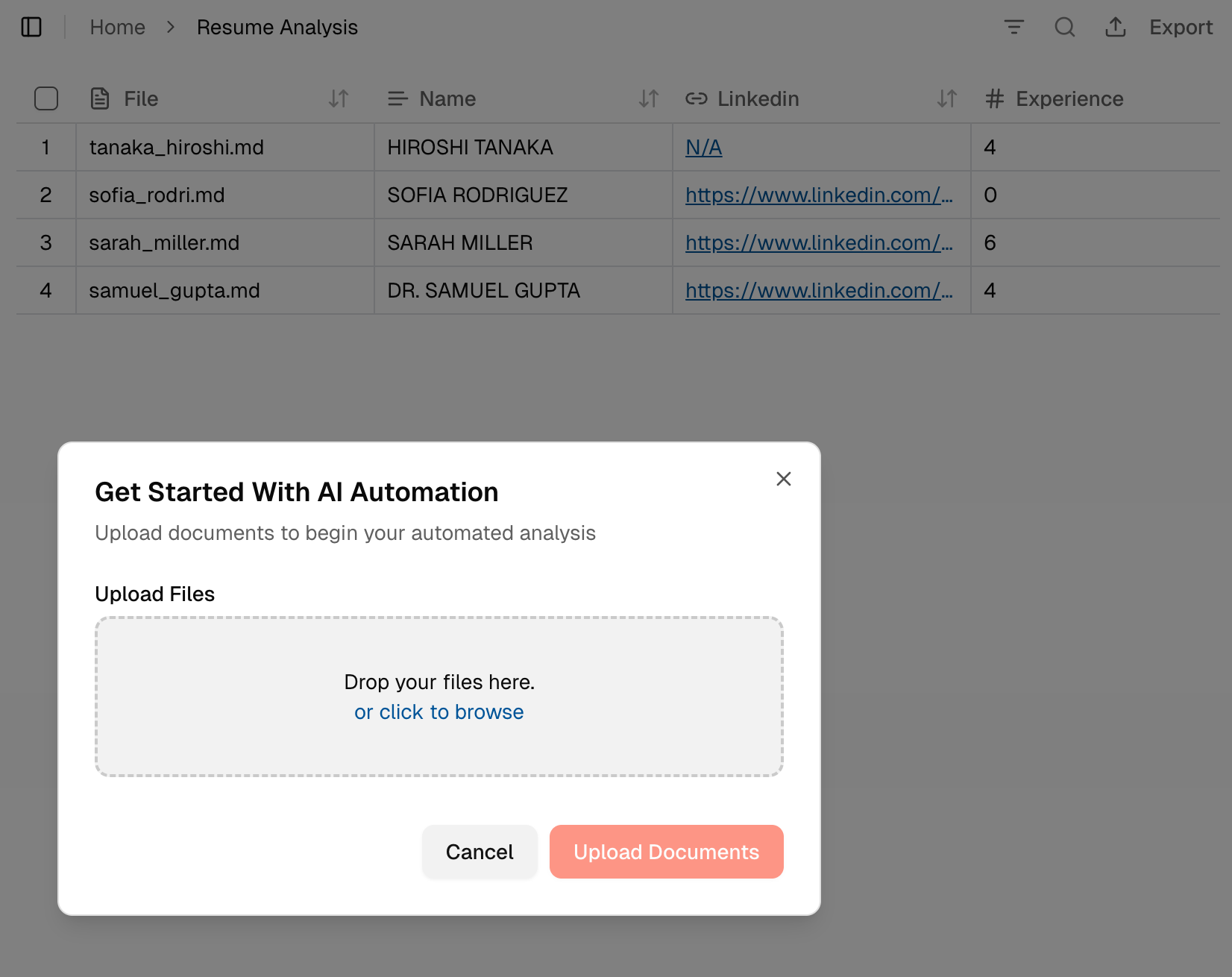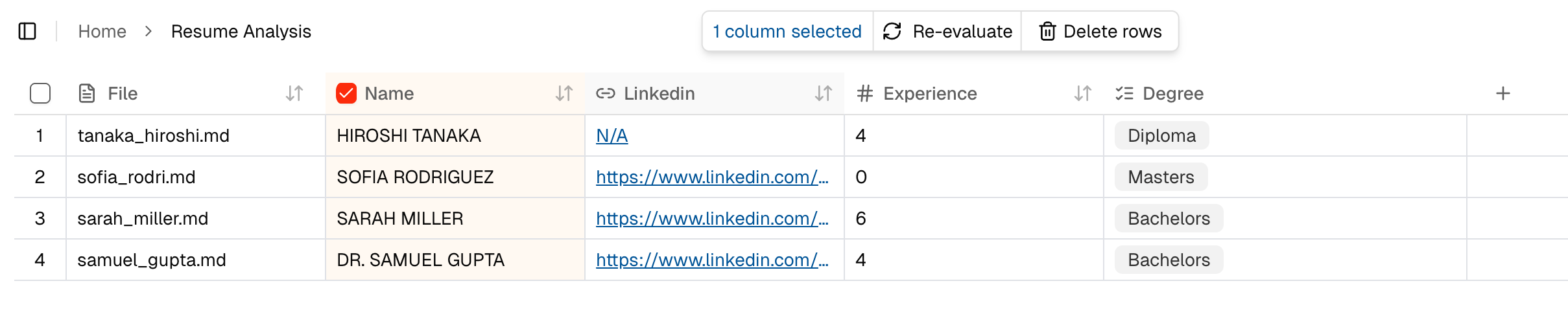 This screen shows the extracted results for your agent. Each row represents one processed file, and each column represents a field defined in the agent.