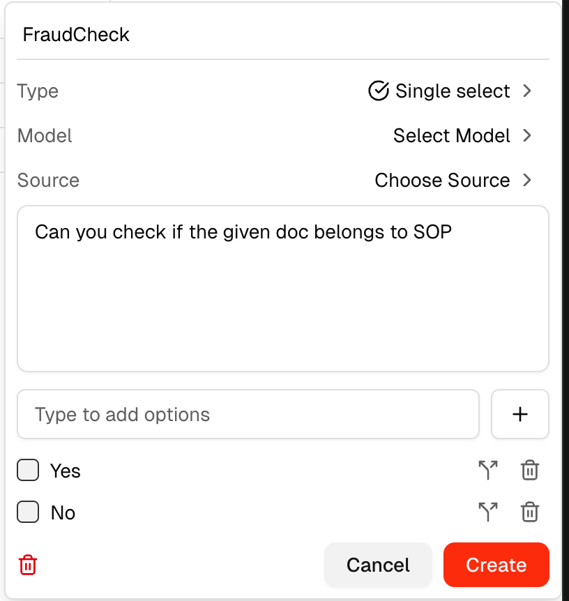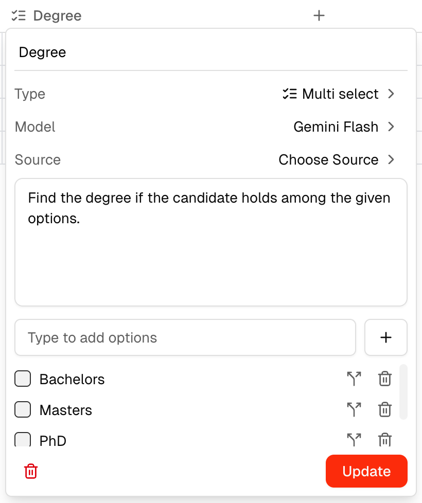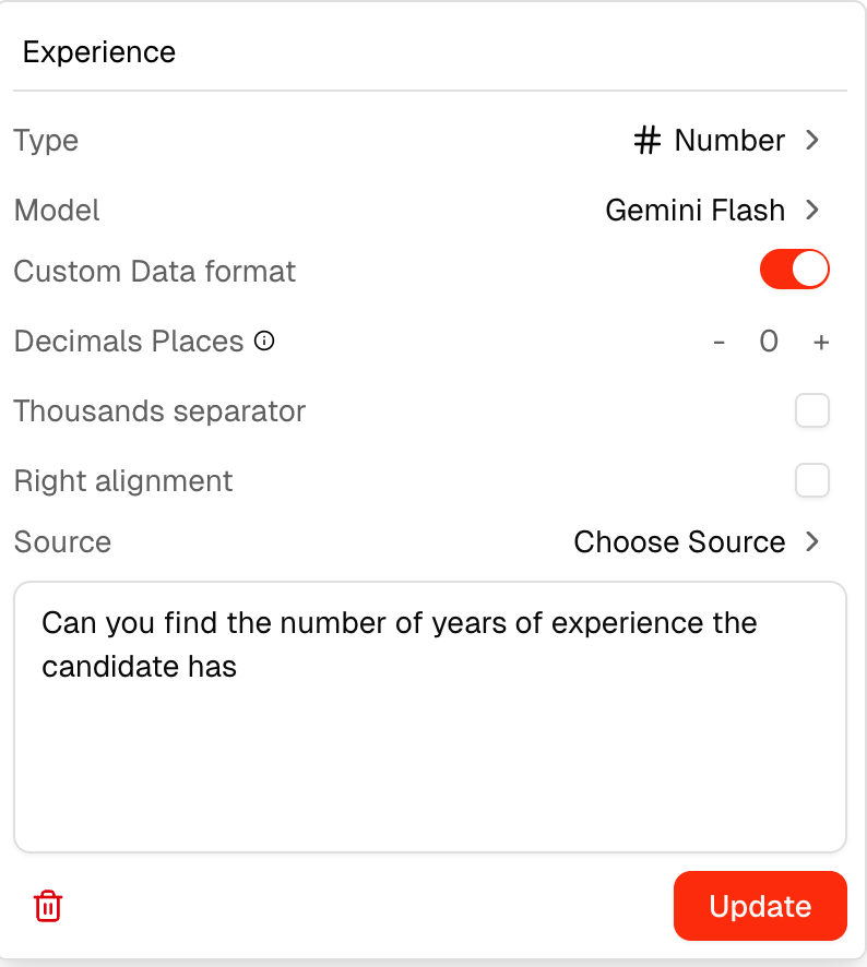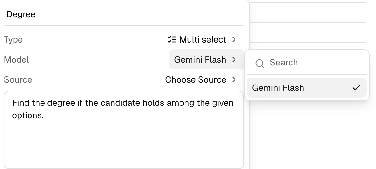 The Choose Source option lets you add context to a field by selecting any file from the library (shown in the dropdown). This gives the model additional reference material when extracting values for that field.