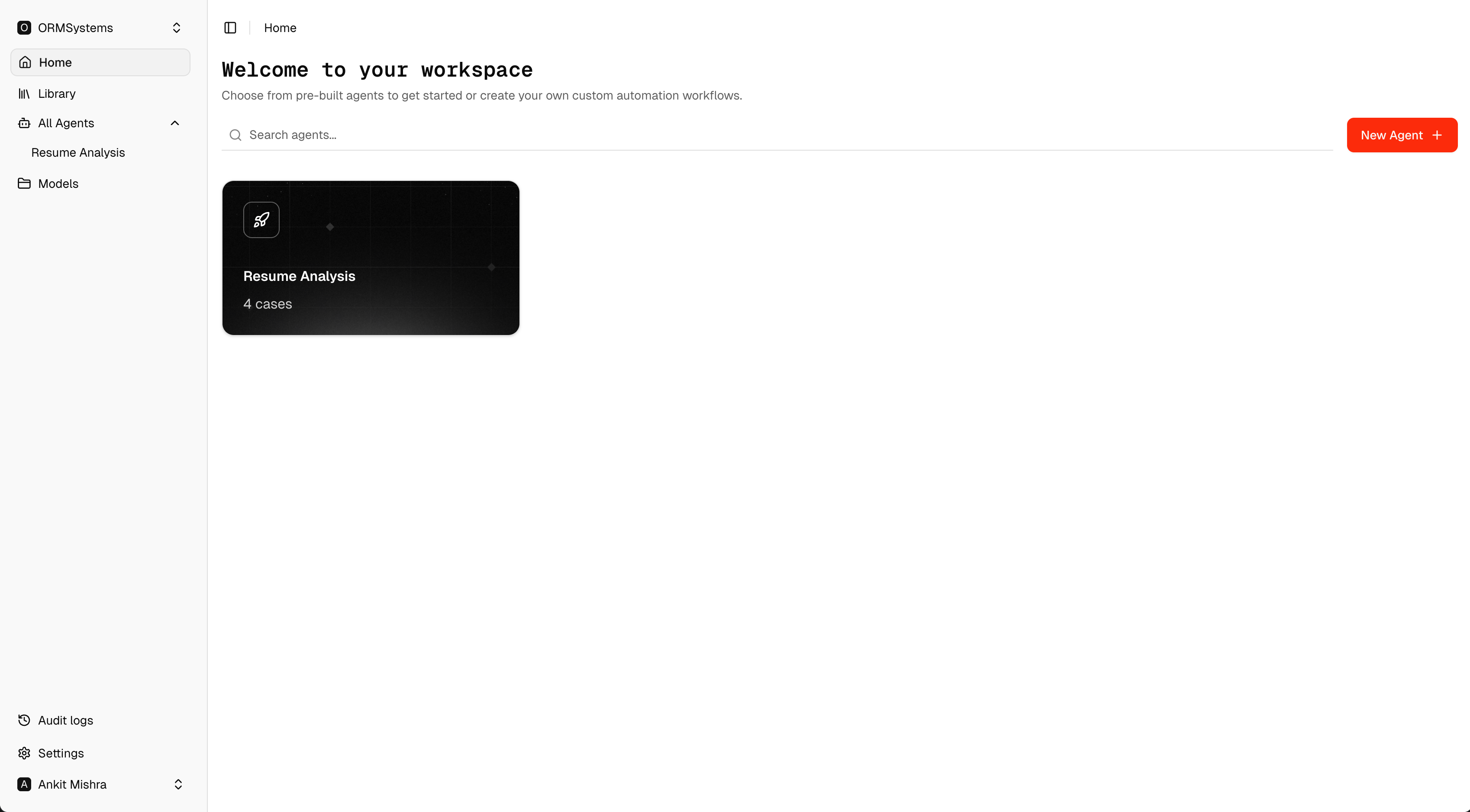 Begin here whenever you want to create a fresh automation workflow. Click New Agent in the top-right corner to get started.